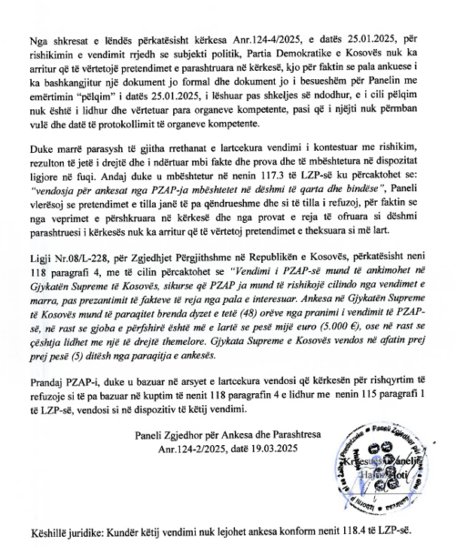 Partisë Demokratike të Kosovës i është refuzuar kërkesa për rishikim të gjobës prej 4 mijë eurove. PZAP e ka cilëuar këtë kërkesë si të pabazuar.