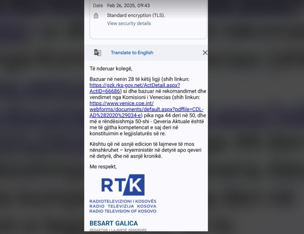 “Qeveria aktuale është me të gjitha kompetencat e saj deri në konstatimin e legjislaturës së re. Kështu që, në asnjë edicion të lajmeve të mos nënshkruhet – kryeministër në detyrë apo qeveria në detyrë, dhe në asnjë kronikë”, thuhet në email-in të cilin e ka publikuar Nacionale.