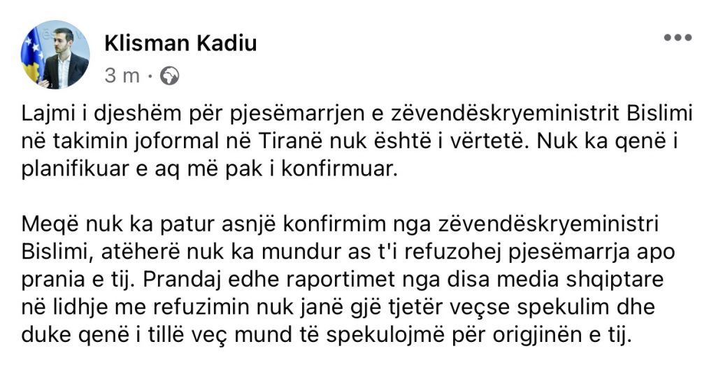 Lajmi i djeshëm për pjesëmarrjen e zëvendëskryeministrit Bislimi në takimin joformal në Tiranë nuk është i vërtetë. Nuk ka qenë i planifikuar e aq më pak i konfirmuar.
