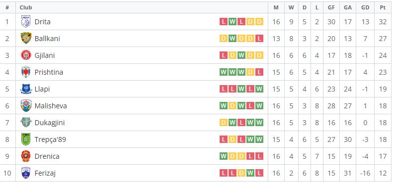 Renditja tabelare pas ndeshjeve të sotme: