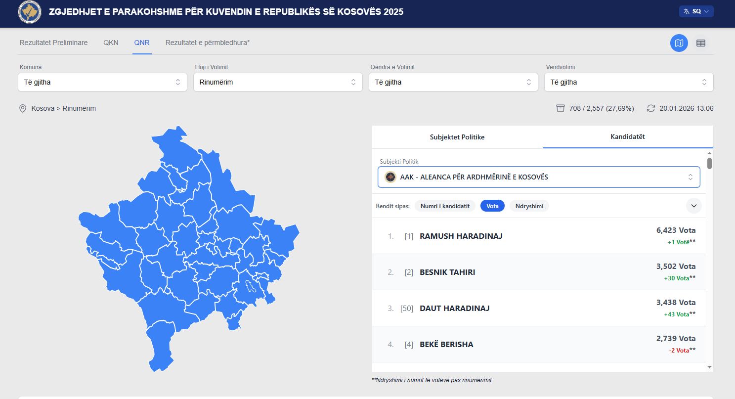 Kreu i AAK-së deri tani ka 1 votë më shumë, ndërsa Daut Haradinaj, Besnik Tahiri, Time Kadrijaj kanë dhjetëra më shumë – veç Bekë Berishës që aktualisht ka dy më pak.