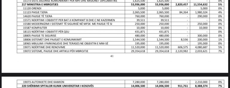 Ndërsa, sipas raportit 6 mujor të Thesarit të Kosovës, në projektin SISTEME, PAJISJE DHE ARTIKUJ PËR MBROJTJE, pra për armatim për Ushtrinë e Kosovës, nga 29,354,618 euro, Qeveria i ka shpenzuar vetëm 7%, ose 2,033,621 euro.
