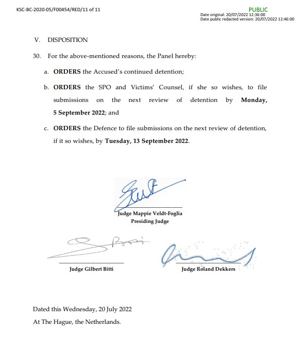 Gjykata ka caktuar datën 5 shtator 2022 si datë ku ZPS-ja mund të paraqes parashtresat për shqyrtimin e radhës për masën e paraburgimit, ndërkaq për palën mbrojtëse ka caktuar datën 13 shtator.