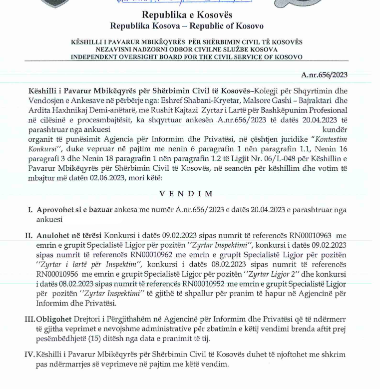 Këshilli i Pavarur Mbikëqyrës për Shërbimin Civil të Kosovës (KPMShCK) ka anuluar një konkurs të Agjencinë për Informim dhe Privatësi.