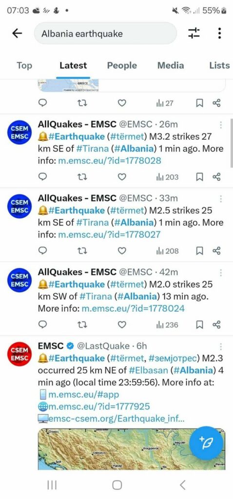 Sipas ESMC, tërmetet janë regjistruar rreth 20 minuta larg njëra tjetrës.