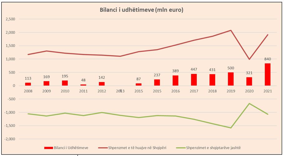 Pamundësia e shqiptarëve për të pushuar jashtë ka bërë që vendi të ketë bilancin më të mirë historik të turizmit. Ky bilanc matet si diferencë e shpenzimeve të të huajve në Shqipëri me shpenzimet e shqiptarëve jashtë vendit.