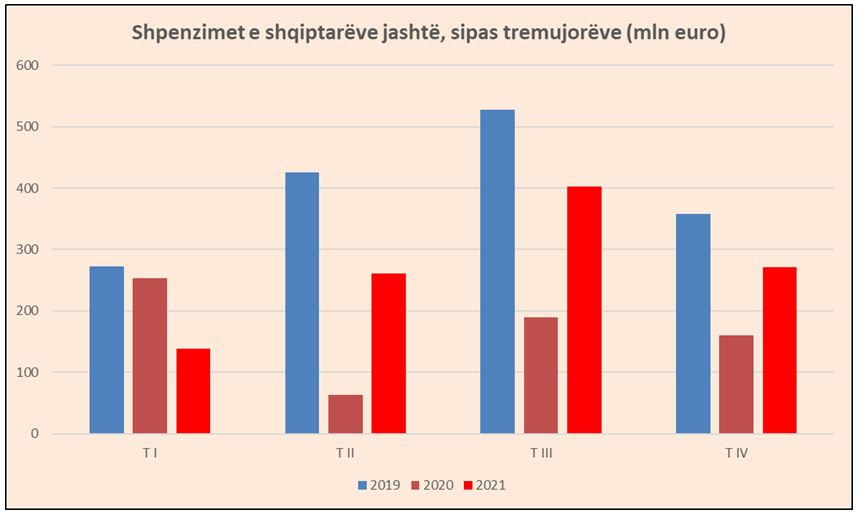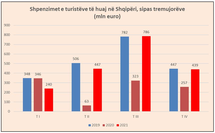 Rimëkëmbja ka ardhur në gjysmën e dytë të vitit, ndërsa pjesa e parë, kur pandemia shënoi një valë tjetër në Europë, ishte e dobët për turizmin. Tremujori i tretë 2021 ishte i vetmi që shënoi të ardhura të barabarta me të njëjtën periudhë të para-pandemisë, duke arritur në 786 milionë euro. Kjo është dhe periudha kur ka një fluks të shtuar të turistëve në vend. Edhe në tremujorin e katërt, të ardhurat ishin pothuajse sa e njëjta periudhë e 2019-s.