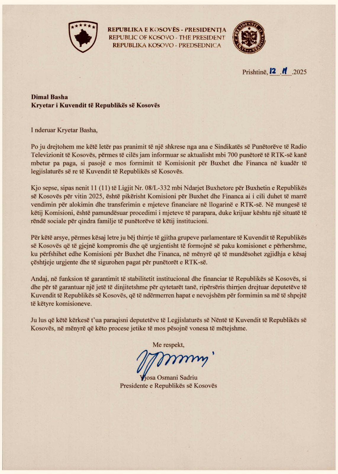 Sindikata e Punëtorëve të Radio Televizionit të Kosovës (SPERTK) i është drejtuar me një letër Presidentes së Republikës së Kosovës, Vjosa Osmani, ku e falënderon për vëmendjen e kushtuar situatës së rëndë financiare në të cilën ndodhet RTK-ja, por njëkohësisht thekson se hapat aktualë nuk ofrojnë zgjidhje urgjente.