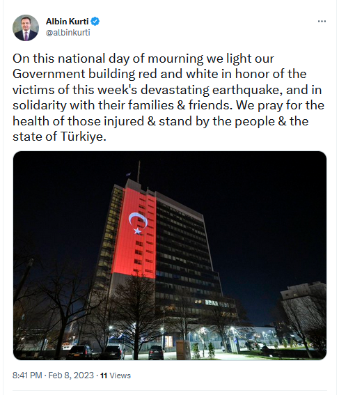 “Në këtë ditë zie kombëtare, ne ndezim kuq e bardhë ndërtesën e Qeverisë sonë në nderim të viktimave të tërmetit shkatërrues të kësaj jave dhe në solidaritet me familjet dhe miqtë e tyre. Lutemi për shëndetin e të lënduarve dhe qëndrojmë pranë popullit dhe shtetit të Turqisë”, ka shkruar kryeministri Albin Kurti.