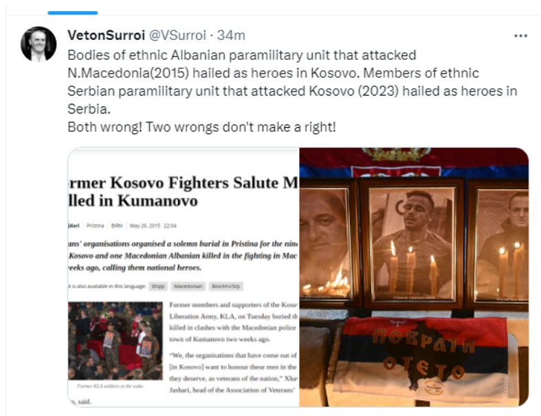 “Trupat e njësisë paraushtarake shqiptare etnike që sulmuan Maqedoninë Veriore (2015) u cilësuan si heronj në Kosovë. Pjesëtarët e njësisë paraushtarake etnike serbe që sulmuan Kosovën (2023) u përshëndetën si heronj në Serbi.Të dyja gabim! Dy gabime nuk bëjnë një të drejtë! “, ka shkruar Surroi.