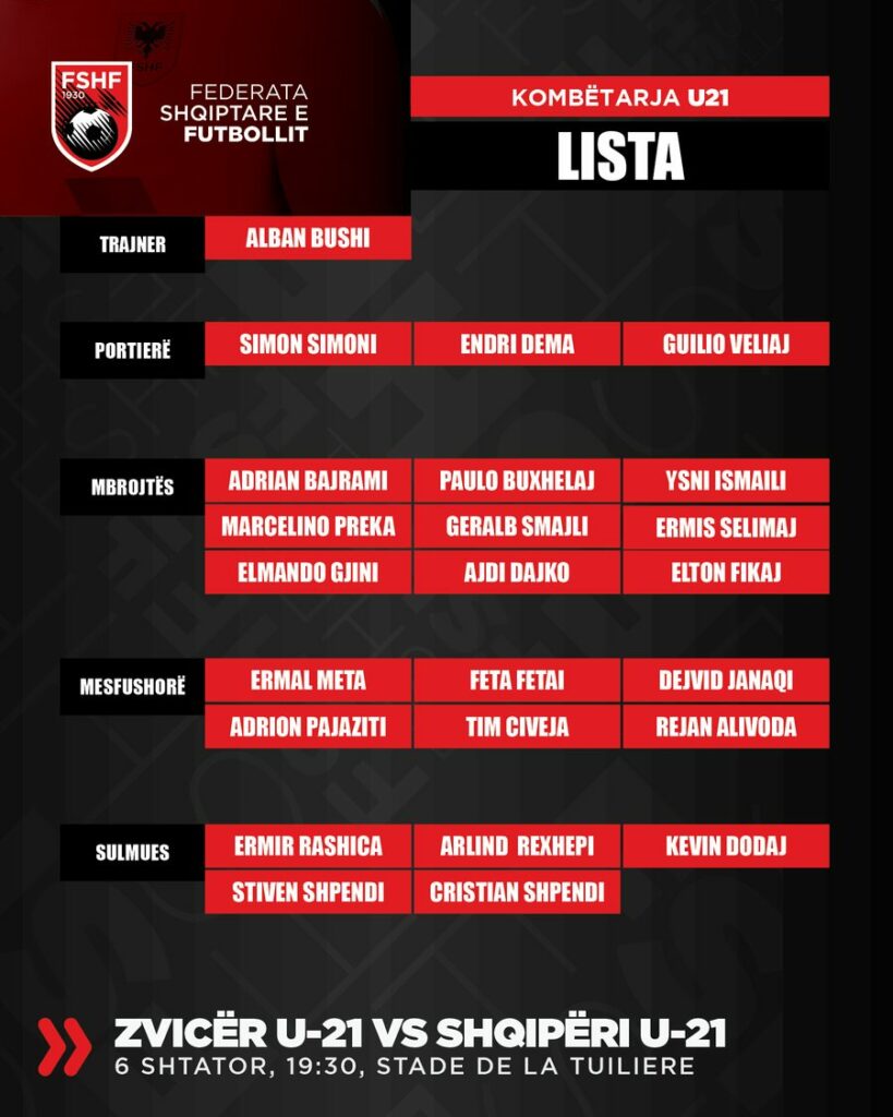 Më poshtë, edhe lista me emrat e 23 lojtarëve të ftuar nga stafi teknik i Kombëtares U-21: