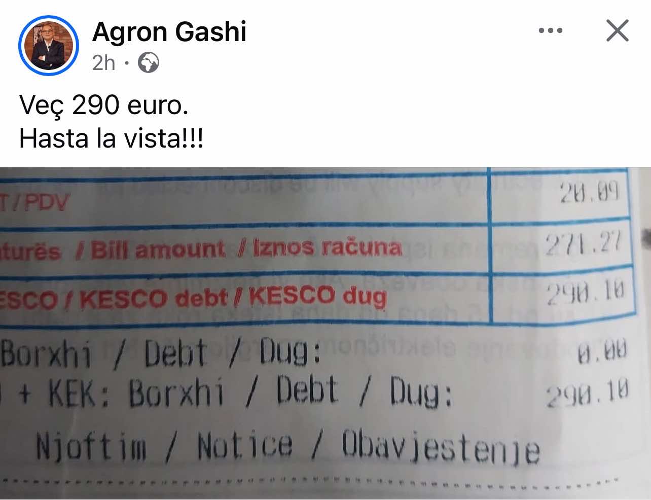 Profesori Agron Gashi ka publikuar një fotografi të faturës së tij të rrymës, njofton Klankosova.