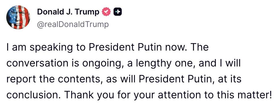 “Jam duke folur me presidentin Putin tani. Biseda po vijon ende, është e gjatë, dhe unë do të raportoj përmbajtjen, ashtu si do të bëjë edhe presidenti Putin, në përfundim të saj”, ka shkruar Trump