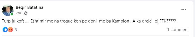 “Turp iu koftë… Është mirë me na tregu kon po doni me bë Kampion. A ka drejtësi o FFK”, tha Beqir Batatina në statusin e tij.