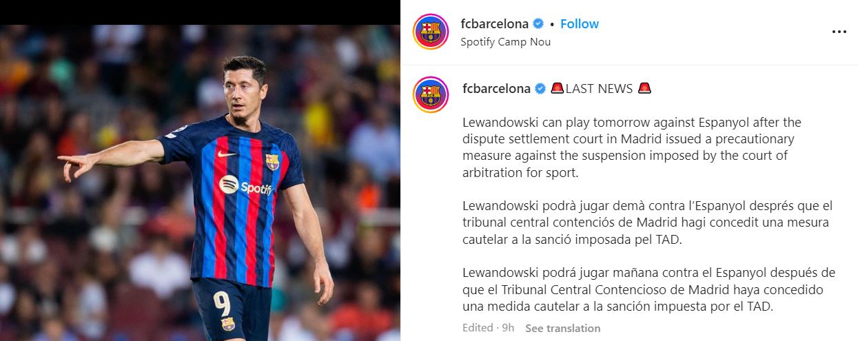 “Lewandowski mund të luajë nesër kundër Espanyolit pasi gjykata e zgjidhjes së mosmarrëveshjeve në Madrid ka vendosur një masë paraprake kundër pezullimit të vendosur nga gjykata e arbitrazhit për sportin.”-njofton klubi blaugrana.
