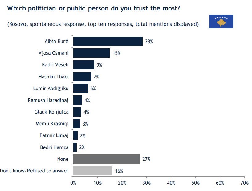 Veseli ka marrë 9% të votave në pyetjen “Cilit politikan, apo personi publik i besoni më së shumti?”.