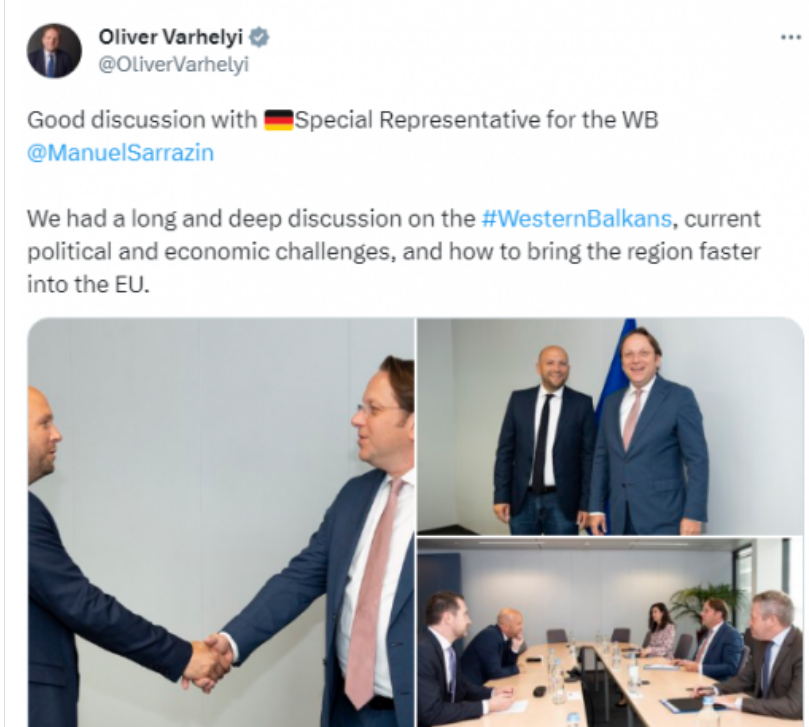Komisioneri evropian për Zgjerimin, Oliver Varhelyi ka diskutuar me emisarin gjerman Manuel Sarrazin për futjen sa më të shpejtë të Ballkanit Perëndimor, në Bashkim Evropian