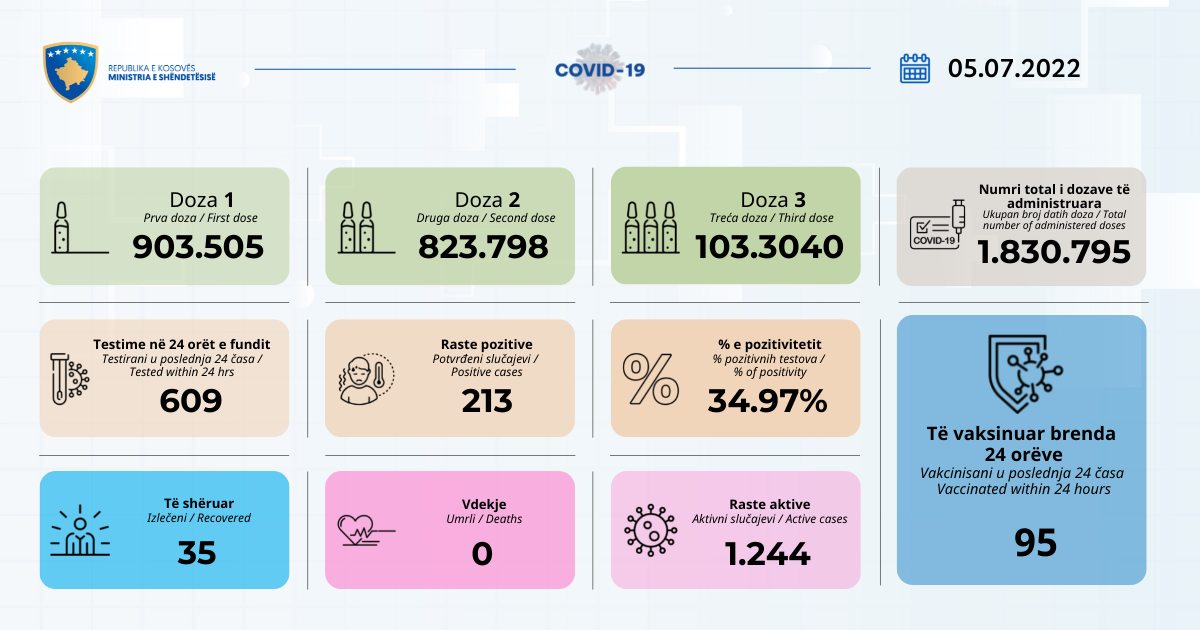 Ministria e Shëndetësisë ka bërë me dije se gjatë 24 orëve rë fundit, 213 qytetarë kanë rezoltuar pozitiv me Covid-19 në Kosovë.