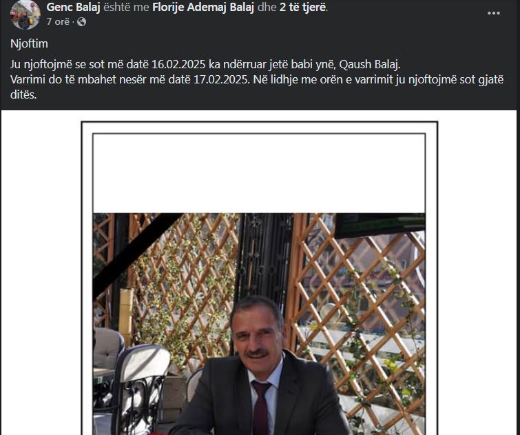 Sipas njoftimit të të birit, varrimi i të ndjerit bëhet nesër, më 17 shkurt.