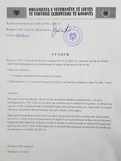 Organizata e Veteranëve të Luftës së UÇK-së ka njoftuar se kanë dalur me një vendim, për të mos bashkëpunuar me Qeverinë e Kosovës, lidhur me festimin e: